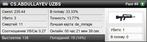 | de_mirage | 2 | 1.00 | 0.33 | 1 | 4 | 00:06:00 | 10.12.2023 | |