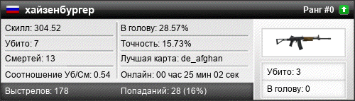 | de_afghan | 4 | 1.00 | 0.42 | 1 | 6 | 00:09:38 | 07.02.2024 | |