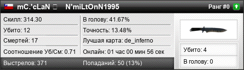 | de_inferno | 8 | 1.00 | 0.37 | 2 | 21 | 00:21:37 | 12.01.2024 | |
