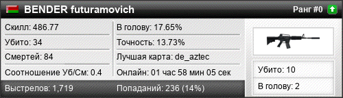 | 10.11.2024 @ 11:09 - 11:23 | de_aztec | 00:13:46 | 10 | 8 | 3 | 30.00% | 8.77% | 359.21 |