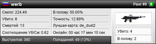 | de_dust2 | 8 | 0.80 | 0.53 | 1 | 20 | 00:15:02 | 02.03.2024 | |