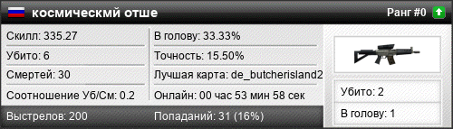 | 03.03.2024 @ 20:47 - 21:06 | de_butcherisland2 | 00:19:31 | 5 | 12 | 2 | 40.00% | 15.74% | 297.51 |