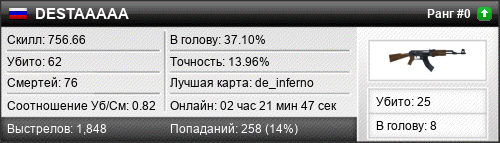 | de_dust2 | 3 | 0.50 | 0.23 | 1 | 8 | 00:12:53 | 06.04.2024 | |