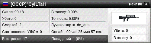 | 16.08.2024 @ 22:28 - 22:29 | de_crane | 00:01:05 | 0 | 1 | 0 | 0.00% | 0.00% | 99.20 |