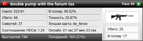 | de_inferno2 | 11 | 1.38 | 0.54 | 1 | 16 | 00:20:15 | 21.07.2024 | |