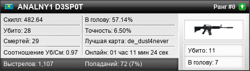| de_dust4never | 10 | 0.83 | 0.44 | 1 | 18 | 00:22:37 | 25.07.2024 | |