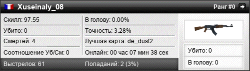 | de_dust2 | 0 | 0.00 | 0.00 | 1 | 2 | 00:03:23 | 26.08.2024 | |