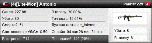 | 26.10.2025 @ 05:31 - 06:41 | de_inferno | 01:09:37 | 19 | 33 | 9 | 47.37% | 23.35% | 227.88 |