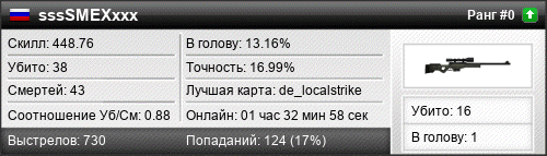 | de_localstrike | 13 | 1.18 | 0.55 | 1 | 17 | 00:23:35 | 21.01.2016 | |