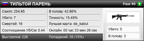 | 18.01.2025 @ 10:45 - 10:57 | de_kabul | 00:12:33 | 4 | 8 | 2 | 50.00% | 13.79% | 227.51 |