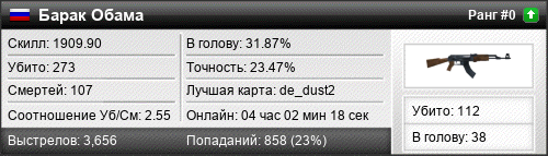 | de_dust2 | 50 | 3.33 | 1.45 | 1 | 20 | 00:34:28 | 12.02.2025 | |