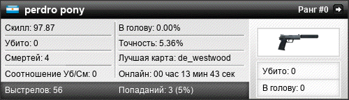 | 19.04.2025 @ 02:18 - 02:23 | de_westwood | 00:04:40 | 0 | 0 | 0 | 0.00% | 0.00% | 97.87 |