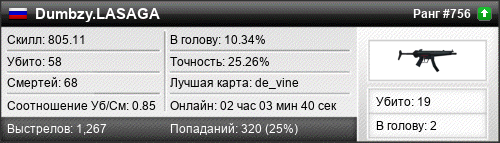 | 03.12.2025 @ 22:37 - 22:55 | de_portation | 00:17:12 | 10 | 9 | 1 | 10.00% | 26.90% | 805.11 |
