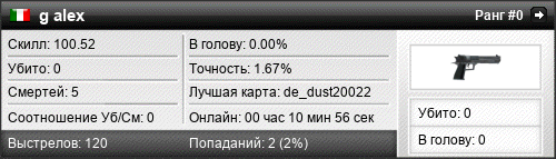 | 19.04.2025 @ 20:21 - 20:24 | de_plaka | 00:03:05 | 0 | 2 | 0 | 0.00% | 0.00% | 100.52 |