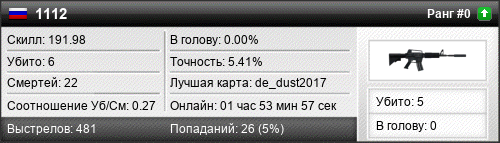| de_dust2017 | 5 | 0.71 | 0.31 | 1 | 9 | 00:16:03 | 08.07.2019 | |