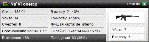 | de_inferno | 14 | 1.75 | 0.98 | 1 | 9 | 00:14:16 | 19.07.2025 | |