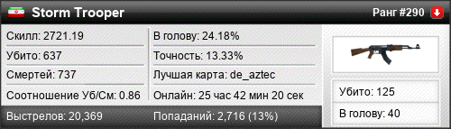 | de_stockyard2 | 13 | 1.44 | 0.29 | 1 | 29 | 00:45:05 | 09.10.2025 | |