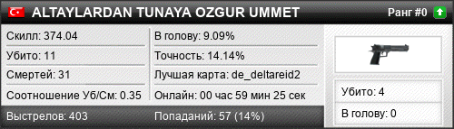 | 09.09.2025 @ 21:58 - 22:04 | de_badday | 00:05:28 | 1 | 3 | 0 | 0.00% | 14.29% | 165.87 |