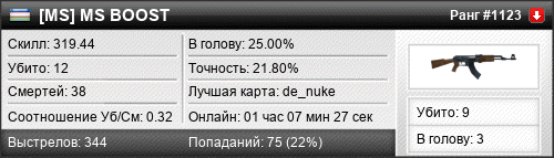 | 21.10.2025 @ 13:11 - 13:50 | de_nuke | 00:38:38 | 10 | 29 | 3 | 30.00% | 21.40% | 262.63 |
