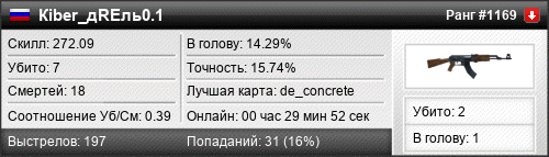 | 22.10.2025 @ 19:17 - 19:30 | de_fuerza | 00:13:09 | 3 | 8 | 0 | 0.00% | 15.96% | 179.26 |