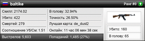 | de_dust2 | 40 | 2.11 | 0.77 | 3 | 43 | 00:51:48 | 29.10.2025 | |