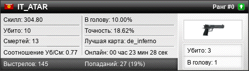 | de_inferno | 8 | 0.67 | 0.39 | 1 | 16 | 00:20:28 | 16.11.2025 | |