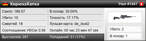 | de_dust2 | 8 | 0.53 | 0.44 | 2 | 24 | 00:18:03 | 20.11.2025 | |