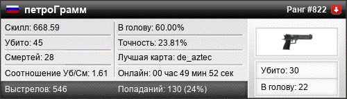 | de_mirage | 9 | 1.12 | 0.47 | 1 | 11 | 00:19:14 | 07.12.2025 | |