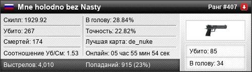 | de_nuke | 55 | 1.38 | 0.77 | 6 | 54 | 01:11:05 | 14.12.2025 | |