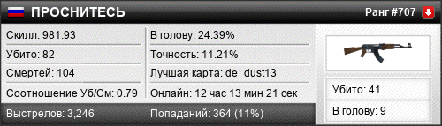 | de_dust13 | 13 | 1.18 | 0.51 | 1 | 19 | 00:25:44 | 27.12.2025 | |