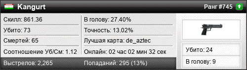 | de_dust2 | 15 | 1.15 | 0.54 | 1 | 19 | 00:27:44 | 04.01.2026 | |