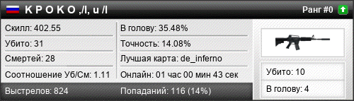 | de_inferno | 10 | 3.33 | 1.61 | 1 | 6 | 00:06:12 | 30.01.2016 | |