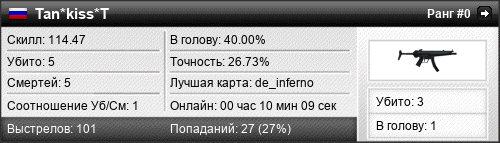 | de_inferno | 5 | 1.25 | 0.58 | 1 | 5 | 00:08:38 | 20.10.2015 | |