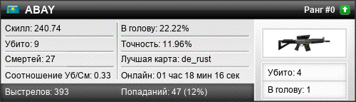 | de_inferno | 0 | 0.00 | 0.00 | 2 | 4 | 00:06:58 | 15.05.2016 | |