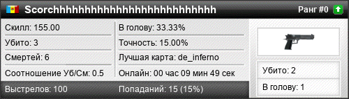 | de_inferno | 3 | 0.60 | 0.40 | 1 | 5 | 00:07:31 | 06.02.2016 | |