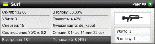 | 04.09.2017 @ 09:53 - 10:08 | de_kabul | 00:14:56 | 3 | 6 | 1 | 33.33% | 10.81% | 132.66 |